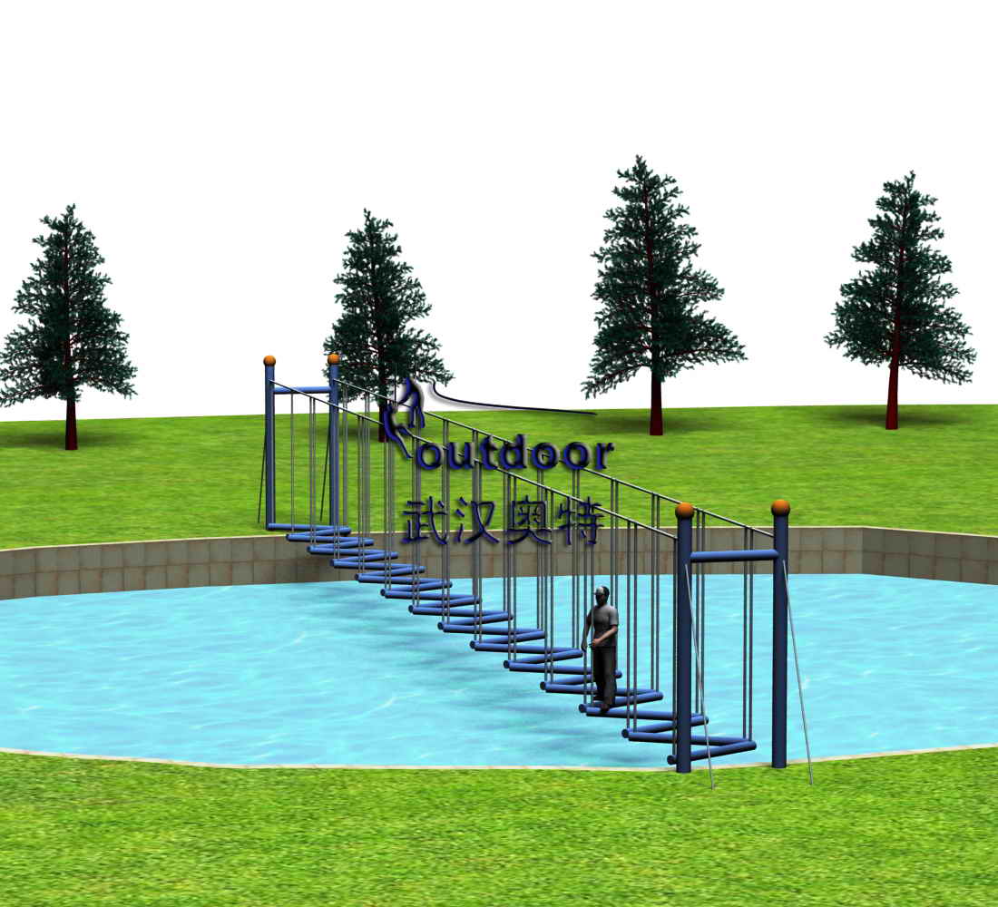 探險器材產品介紹:參與者雙手扶著保護繩,穿越水上簡易的之字橋面