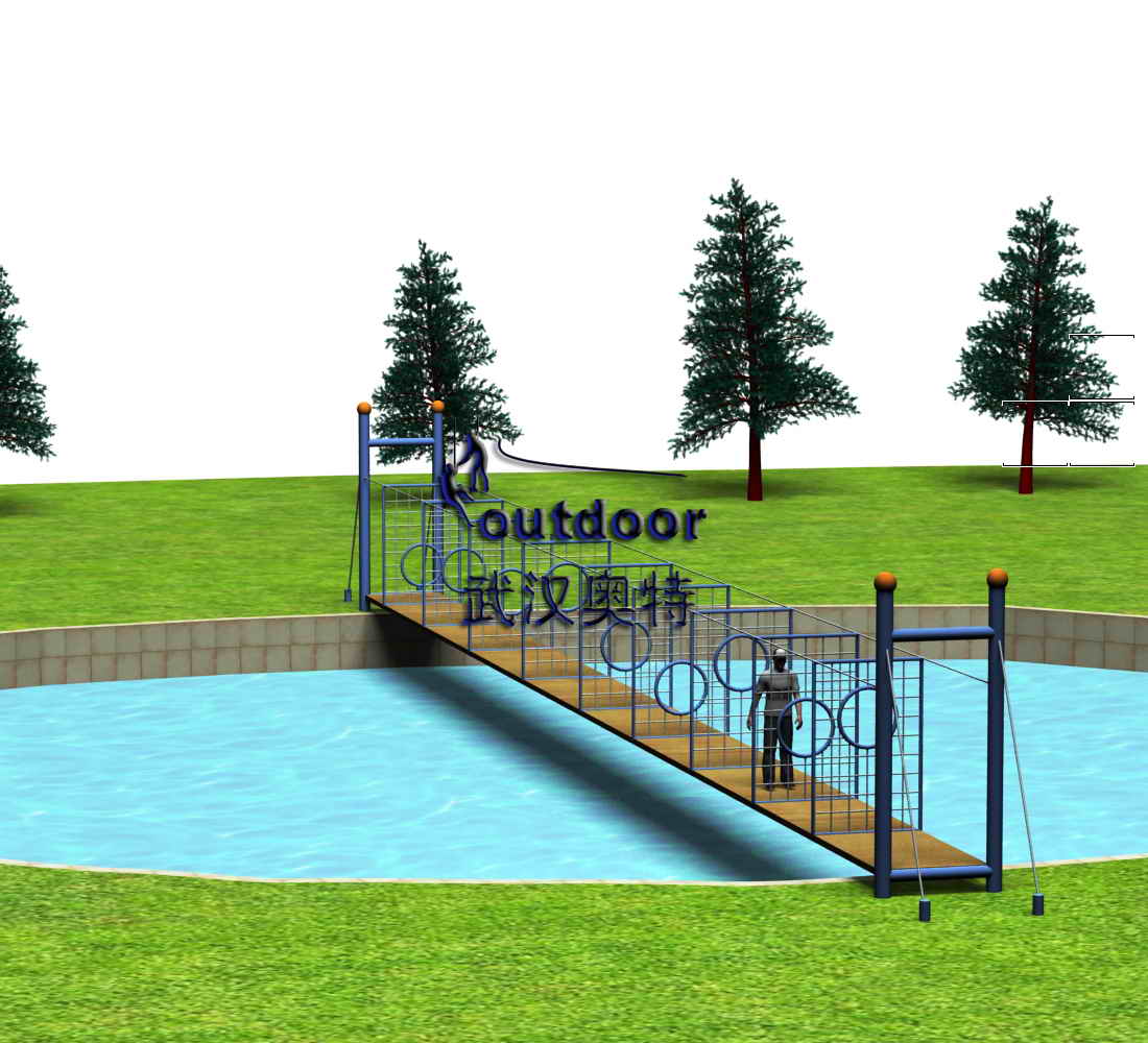 探險器材產品介紹:參與者需要穿越木板橋面上一個個的鐵環,鍛煉身體協調