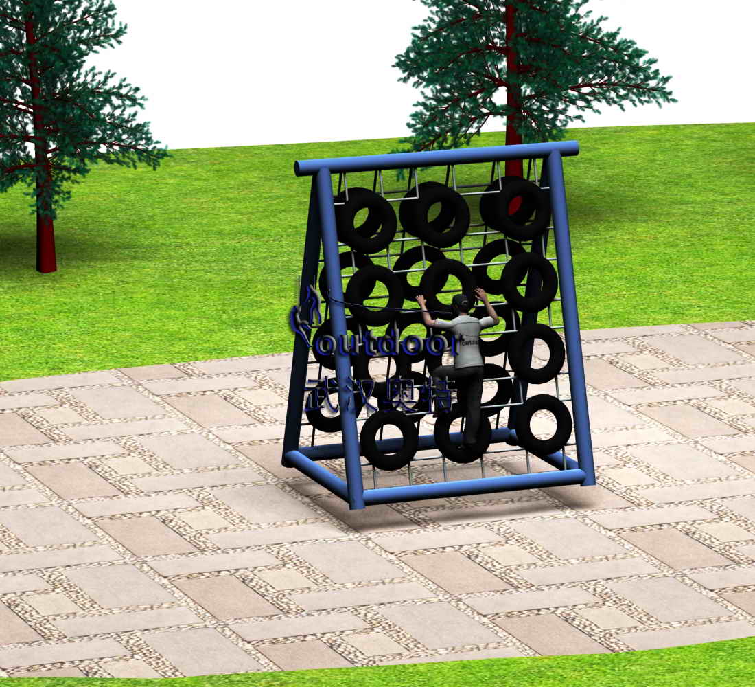 探險娛樂器材產品介紹:一座輪胎組成的攀爬墻,參與者需要小心翻