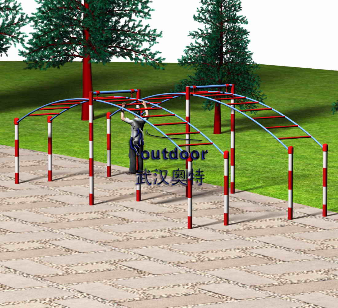 隊員利用助跑沿引橋沖上助木,迅速通過并跳到地面。